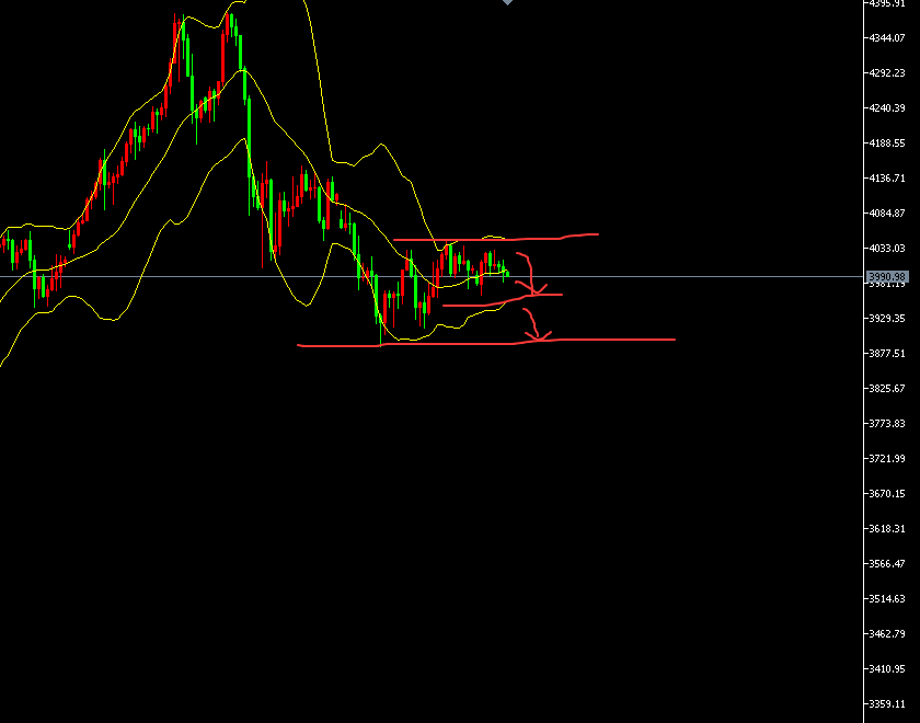 4小时图暂时围绕布林道上轨与下轨之轨之间收缩震荡,昨日二次测试上轨处承压回落收盘在中轨附近,今日破中轨向下轨运行,目前布林道收口,短线可能还会伴随迂回反复,但结合月线级别的调整,整理后看好进一步破低下行。破位只是时间问题,昨日在4010-4020分批做的空单继续持有。空仓的今日在4000-4010处依旧可加仓分批进空 防守在4031.50即可目标下看3950-3930减个仓再看破位空间。