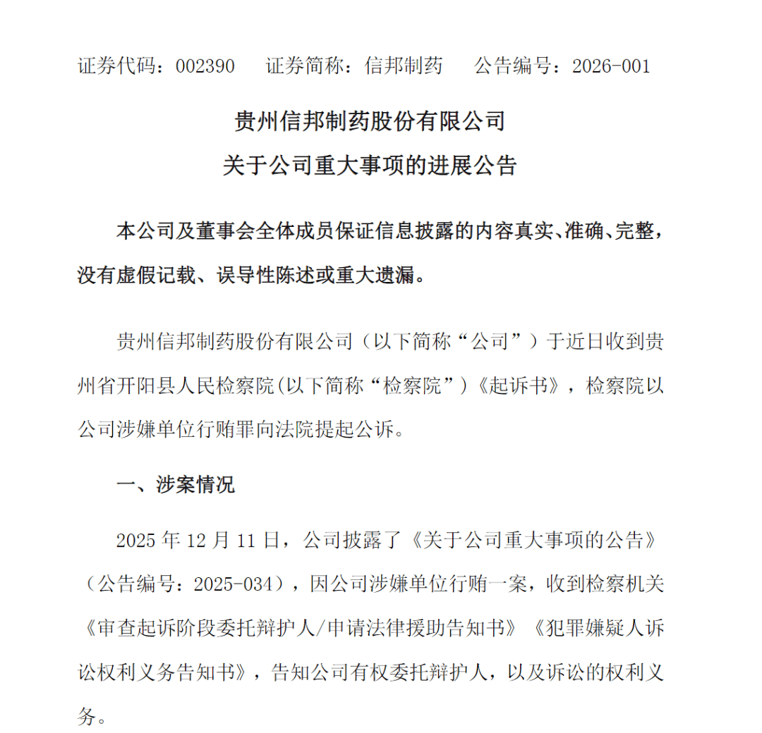信邦制药曾在2025年12月10日晚间公告,公司于近日收到检察机关《审查起诉阶段委托辩护人/申请法律援助告知书》《犯罪嫌疑人诉讼权利义务告知书》,主要内容为:对公司涉嫌单位行贿一案,检察机关已经收到监察委员会移送起诉的材料。
