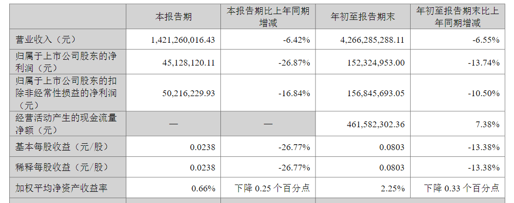 2025年前三季度,信邦制药实现营业收入42.66亿元,同比下滑6.55%;实现归母净利润1.52亿元,同比下滑13.74%。