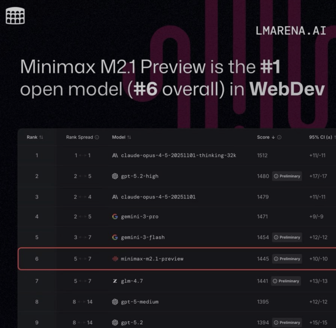 而在作为认知核心的文本模态上,M2.1模型的表现尤为关键,它在大模型竞技场(LMArena)Coding榜单中拿下了开源模型第一的成绩。