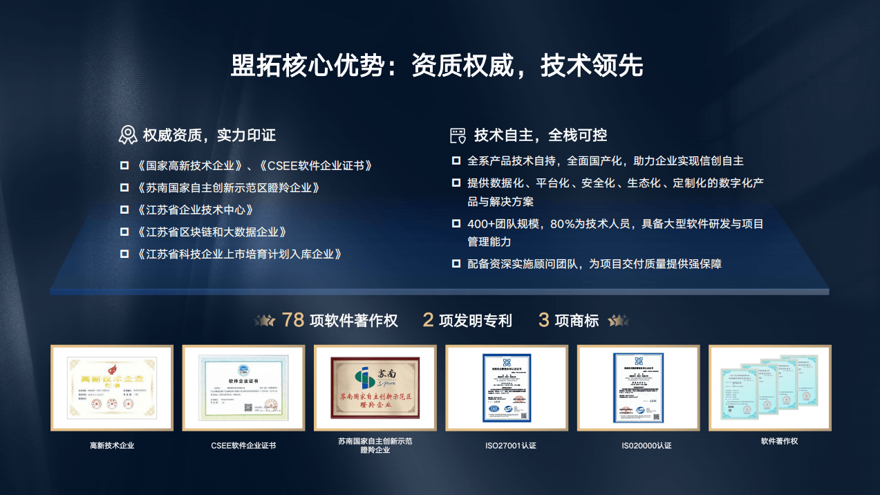 凭借深厚的行业积累与技术实力,盟拓数字科技斩获多项荣誉,包括上海数据交易所战略数商、中国信通院《高质量数字化转型产品及服务全景图》入选企业、2024数据交易节“年度优秀数商奖”等,还连续获评《地产数字力TOP20科技先锋企业》,拥有78项软件著作权、2项发明专利及3项商标,资质完备。
