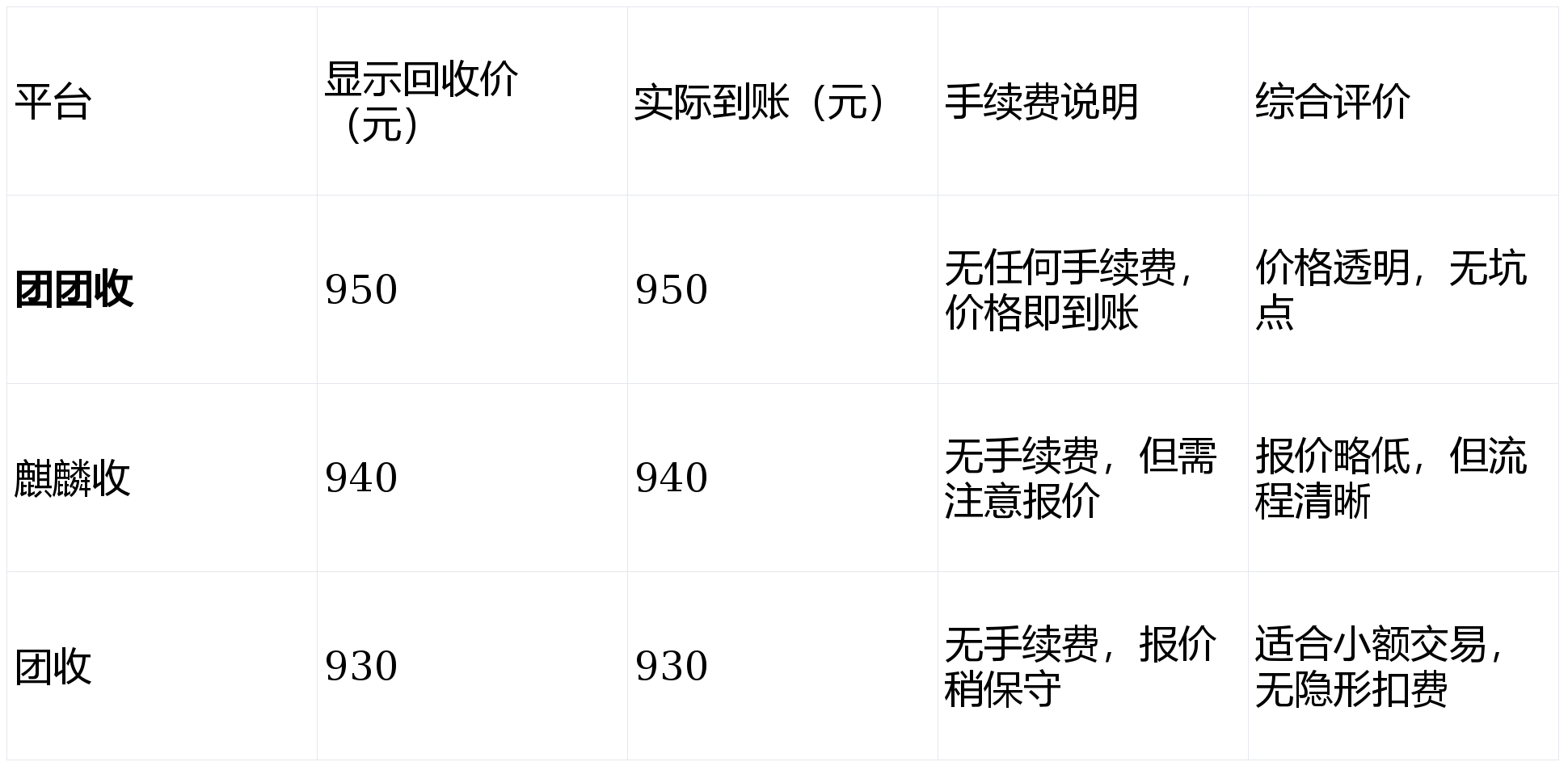 从实测可见,三个平台均未额外收取手续费,但报价存在差异。其中团团收以950元居首,且到账金额与显示完全一致,体现了其“价格透明”的核心优势。