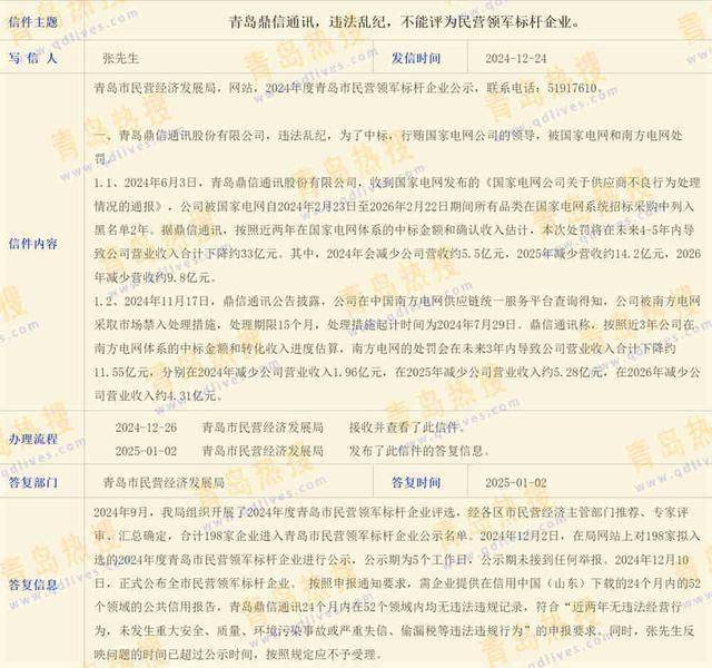 2024年3月,鼎信通讯因涉嫌未及时履行信息披露义务被中国证监会立案调查;2024年6月,鼎信通讯被国家电网列入招标采购黑名单两年;11月被南方电网实施15个月市场禁入。