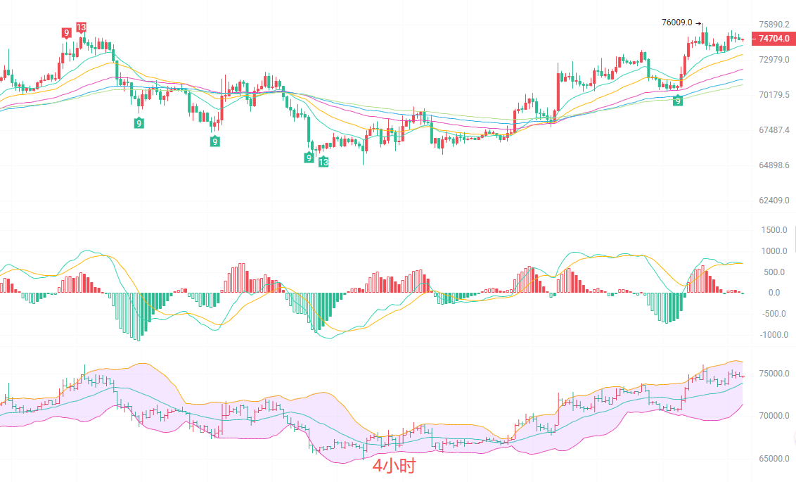 日K线走出了明确的上涨行情,当前成功站上EMA15、EMA30均线,多头趋势初步确立。MACD红柱持续放量,DIF与DEA在零轴上方维持上行,未出现背离信号;布林带开口逐步扩大,价格向布林上轨运行,说明日线级别的上涨动能仍在释放,上方压力看76000-76500,下方支撑看72000附近的布林中轨。