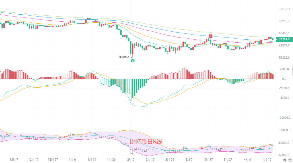 日K线价格仍维持在所有中长期EMA均线之上,均线北上排列依然有效,说明中期上涨趋势没有发生根本改变。MACD红柱持续缩短,显示北上动能有所减弱,布林带开口向上,中轨71600形成强支撑,当前价格处于上轨与中轨之间的震荡区间,属于上涨过程中的正常回调,尚未出现趋势反转信号。