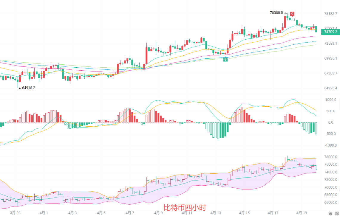 四小时K线附近震荡,MACD已形成死叉,绿柱持续释放,短期南下力量主导调整行情。价格跌破了短期上升趋势线均线拐头向下,短期压力明显,下方支撑集中在73500-74000区间,若此处失守,调整幅度可能进一步扩大,反之北上趋势依旧有效