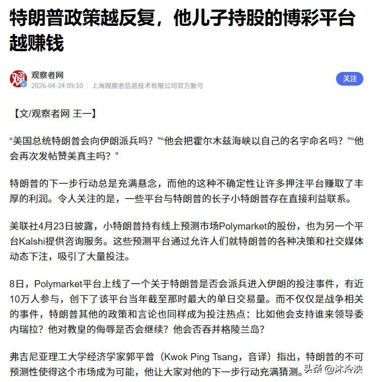 特朗普嘴上喊着“为美国利益”,实际在为儿子的钱包服务;嘴上说着“打击伊朗”,实际在给预测平台制造热点;嘴上说着“停火谈判”,实际在给资本收割铺路。