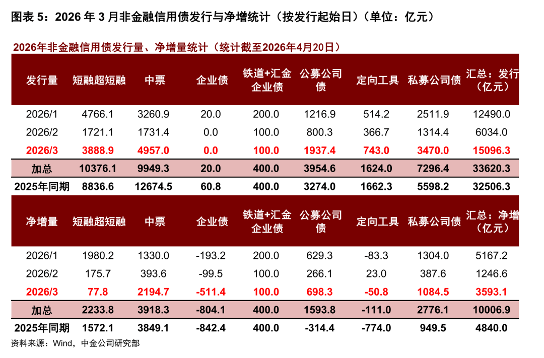 信用债:2026年3月随春节假期影响消退,信用债发行、净增均大幅抬升,中票、公私募公司债、5-10年、高评级、央国企贡献多数净增量。