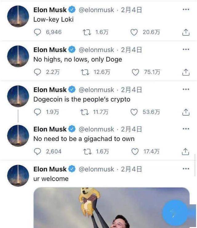 世界首富、特斯拉CEO埃隆·马斯克也起到了推波助澜的作用。2月4日下午,马斯克接连发推力挺狗狗币,称 “我们不需要成为亿万富翁就能拥有狗狗币,狗狗币才是人民的虚拟货币。我没喝多,也没情绪低落,心里只有狗狗币。”