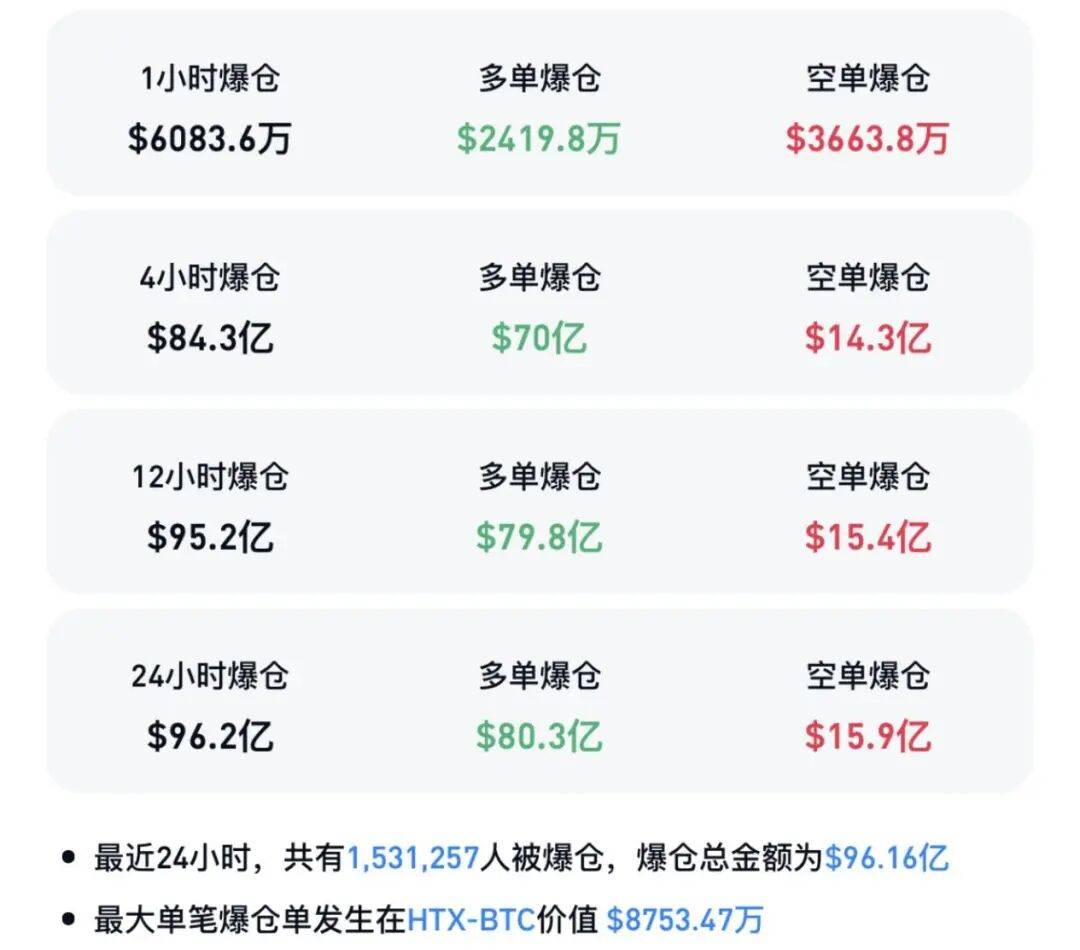 2025-10-14交易所,交易所排名,交易所排行,加密货币是什么,加密货币交易平台,加密货币平台,币安交易所,火币交易所,欧意交易所,Bybit,Coinbase,Bitget,Kraken,全球交易所排名,交易所排行爆仓总金额为96.16亿美元,其中多单爆仓80.3亿美元,空单爆仓15.9亿美元。