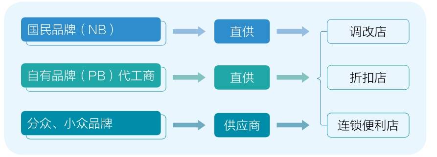 第一类:跨国品牌和本土知名品牌(国民品牌,National Brand,简称 NB)。可以上架,但要求品牌商直供。直供即去中间商化,绕过经销商渠道体系。按照“宽类窄品”的逻辑,一个品牌商直供的 SKU(最小存货单位)是极为有限的,且不能集中陈列。品牌商通过大量 SKU占据大量终端资源的现象将不复存在。当然,这也是诞生国民大单品的机遇。